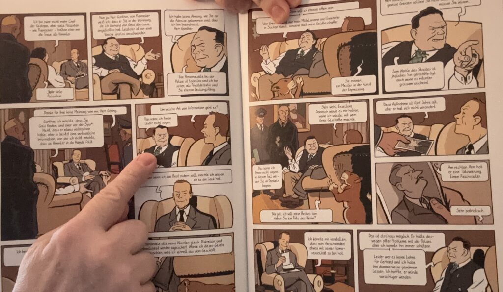 Diese typische Gunther-Atitüde, diese Mischung aus Berliner Schnauze und Chandler’schem Hardboiled-Duktus, ist essenziell für den Erfolg der Geschichte. Es ist diese Ansprache gegenüber allem und jedem, Kioskbesitzer oder Nazi-Größe, die den Leser fasziniert und erschreckt zugleich. Der Comic nutzt Voice-Over-Boxen (Erzählertexte), um zusätzlich Bernies innere Monologe wiederzugeben. Philip Marlowe lässt grüßen. Das funktioniert erstaunlich gut und überträgt so natürlich auch den literarischen Witz Kerrs in die Sprechblasen, den ich an dieser Stelle einmal vorraussetze.