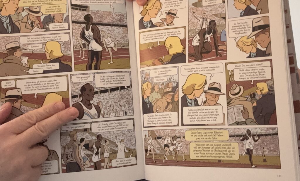 Die Gesichter sind markant, leicht karikaturesk überzeichnet. Das passt hervorragend zur Darstellung der Nazi-Größen (wie Göring oder Heydrich), deren moralische Hässlichkeit so auch optisch erkennbar wird. Die Farben sind zurückgenommen, oft in Sepia-, Grau- oder Brauntönen gehalten. Sie vermitteln das Gefühl einer Stadt, die unter dem ideologischen Smog und der politischen Beklemmung erstickt. Nur selten brechen grelle rote Hakenkreuz-Fahnen die Tristesse auf – ein effektives Stilmittel, das die Omnipräsenz des Regimes betont.