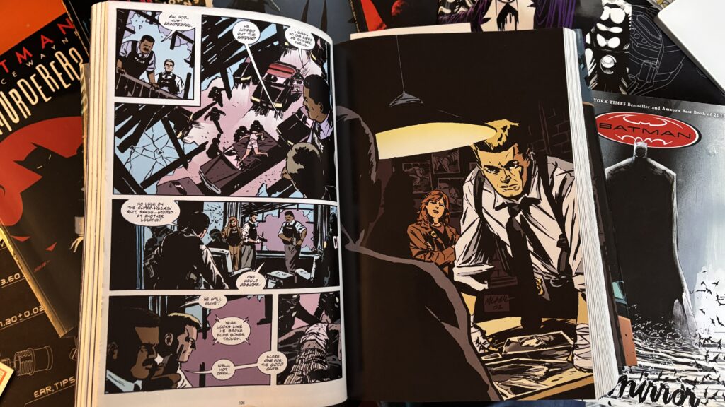 Man merkt der Serie an, dass hier zwei Meister ihres Fachs am Werk waren, die sich die Bälle zuspielen. Ed Brubaker: Wer seine Solo-Werke wie „The Fade Out“ oder seinen legendären „Captain America“-Run (der uns den Winter Soldier gab) kennt, weiß: Brubaker liebt den (Film) Noir. Er liebt kaputte Charaktere, Zigarettenrauch und moralische Grauzonen. Gerd hat gerade jüngst seine kongeniale Serie „Criminal“ vorgestellt, in der Brubaker ebenfalls mit diesen Gewürzen kocht. In „Gotham Central“ bringt er genau diese dreckige „Film Noir“-Stimmung ein. Er erzählt von Cops, die müde sind, die Fehler machen und die manchmal selbst kriminell werden.